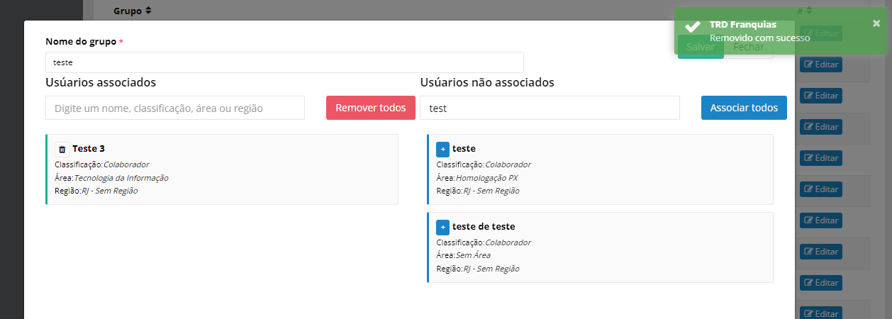 Após a remoção do colaborador, o nome dele passará para a lista dos nomes não associados.