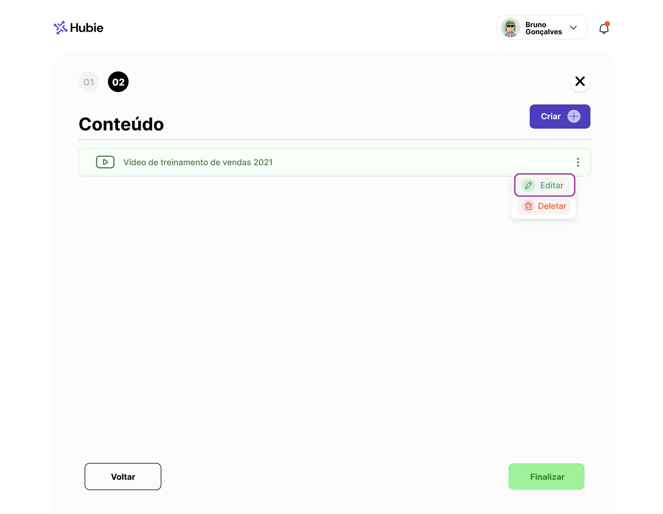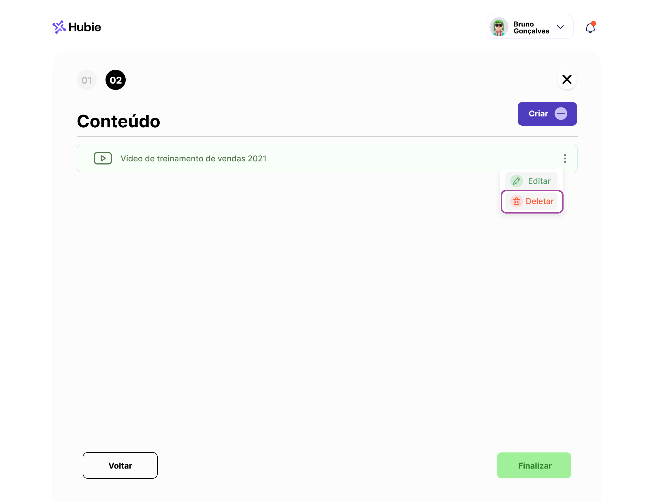 Para deletar um conteúdo selecione “deletar”, nos três pontos, no canto direito, e confirme a ação.